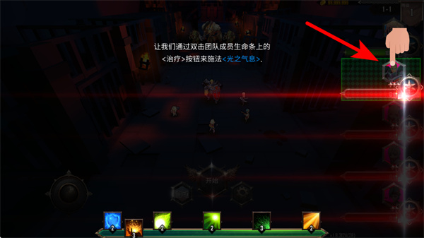 4、按照提示双击红色箭头指向的生命条上的治疗按钮,可释放光之气息技能,为团队成员恢复血量。