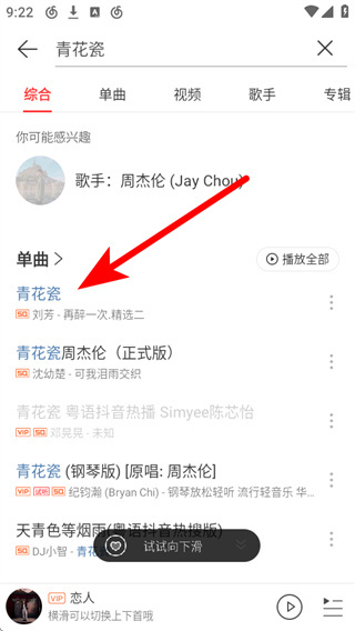 3、在搜索结果中找到目标歌曲,点击该歌曲条目进入播放页面。