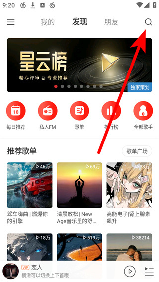 1、打开网易云音乐,点击页面右上角的搜索图标,进入搜索页面。