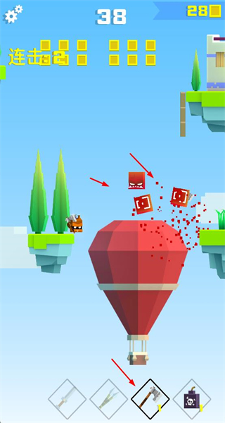 1、操控角色攻击敌方单位时触发连击效果,同时利用场景中的热气球等元素,扩大攻击范围以高效击败多个敌人。