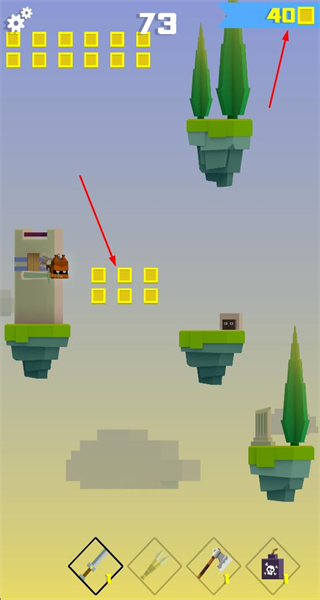 2、在多平台场景中持续击败敌人,积累连击数与击杀数,提升关卡结算时的收益,同时收集场景中的道具强化自身。
