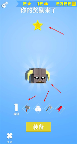 4、关卡结算后获取奖励,包括星级、外观道具与装备道具,点击装备可使用新获得的道具,提升角色战斗能力。