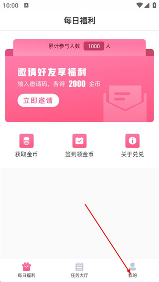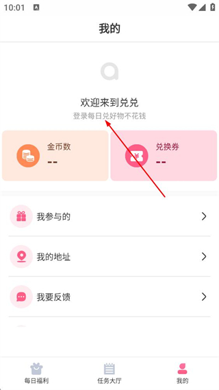 2、在我的页面,点击欢迎来到兑兑-登录每日兑好物不花钱区域,进入登录页面。