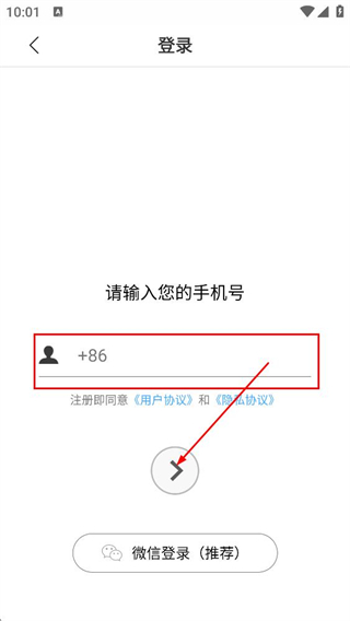 3、在登录页面,填写请输入您的手机号对应的号码,点击箭头按钮进入验证码填写环节。