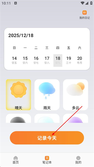 3、在笔记本页面,选择对应的天气状态后,点击记录今天,进入页面。