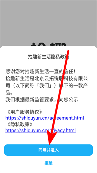 1、在拾趣新生活,在弹窗点击同意,进入页面。