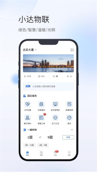 小达物联是深圳达实物联网技术打造的园区物业与企业智能办公平台,以温暖、智慧、低碳为核心理念,集成邀约、预订、报修、呼叫等实用功能,打破传统办公束缚,精准记录每项工作轨迹,让日常工作条理清晰,同步实现效率提升与环保践行,带来全方位便捷体验。