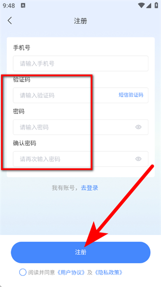 5、输入验证码,设置密码,勾选相关协议后,点击注册,进入注册。