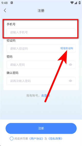 4、在注册页面,输入手机号,点击短信验证码。