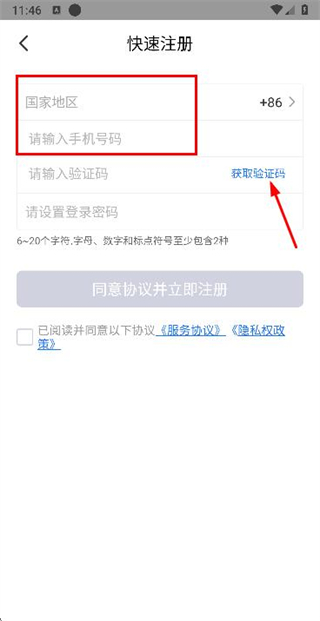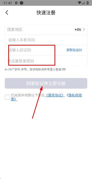 3、在注册账号页面填写验证码和密码,勾选协议后点击同意协议并立即注册完成注册操作。