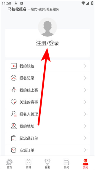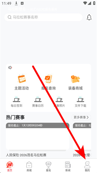1、打开马拉松报名,进入首页后点击底部导航栏的我的,进入个人中心页面。