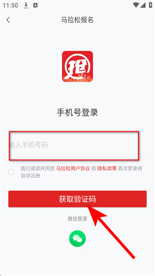3、在手机号登录页面的输入框中,填写自己的手机号码,同时勾选相关协议,随后点击获取验证码。
