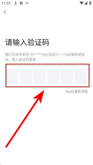 4、进入请输入验证码页面后,将收到的6位数短信验证码填入输入框,即可完成账号的验证码登录操作。