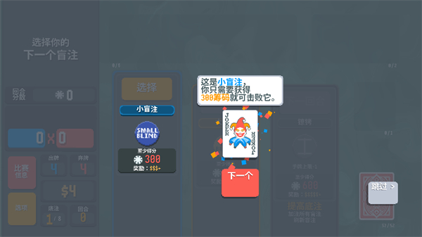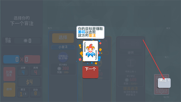 2、当前界面显示你的目标是赚取筹码以击败敌方的盲注,可选小盲注后点下一个或直接点跳过推进游戏。