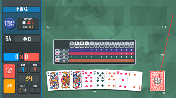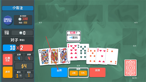 4、在小盲注对局界面中,可通过理解的点数、花色整理手牌后,点击出牌打牌获取筹码也可选择弃牌。