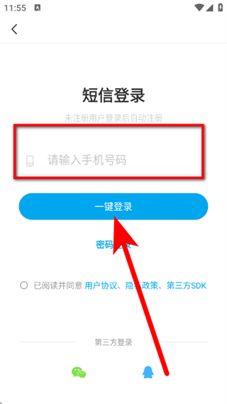 3、在短信登录页面,输入手机号码,点击一键登录。