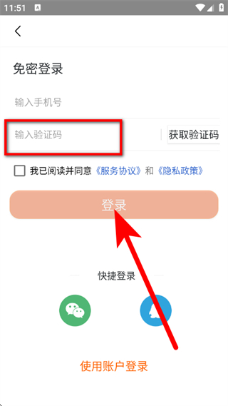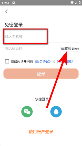 3、在免密登录页面,输入手机号,点击获取验证码。