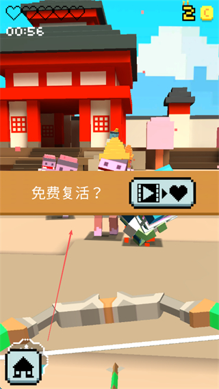 4、生命值耗尽后,界面显示免费复活,可选择复活继续游戏或退出。