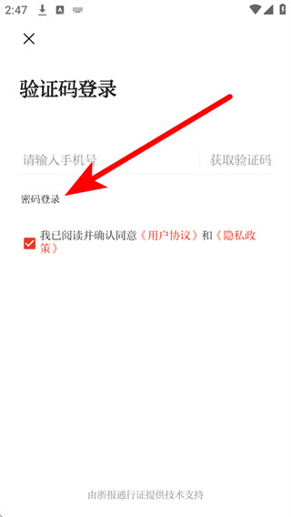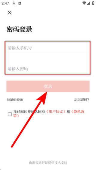 4、在密码登录页面,依次填写手机号和密码,勾选相关协议后,点击登录,即可完成账号登录。