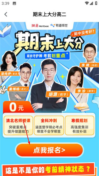 1、在有道领世首页点击期末冲刺选项,进入期末上大分高二活动页面。