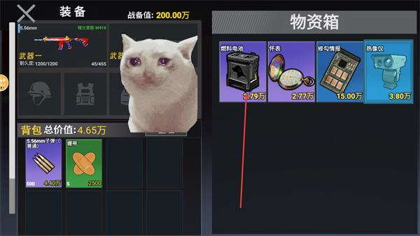 3、在物资箱搜索界面可以查看到武器耐久,从物资箱中获取燃料电池等道具,提升战备值与背包资源储备。