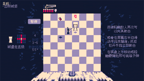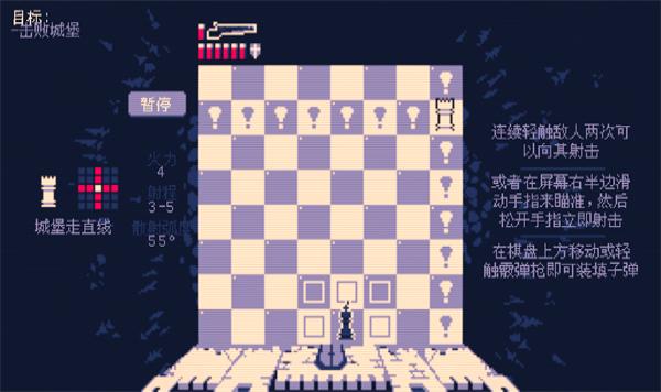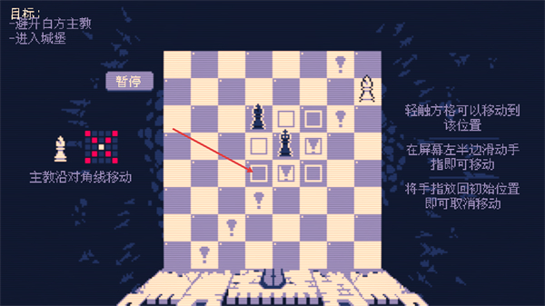 3、明确目标为避开白方主教、进入城堡,按提示轻触方格或滑动手指移动角色,执行对应操作推进关卡。