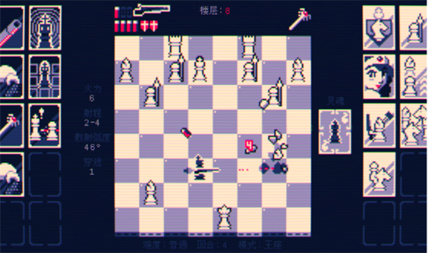 1、在霰弹国王终局将死游戏启动界面,点击游玩按钮,即可进入游戏,开启该像素风格棋局战斗的流程。