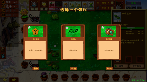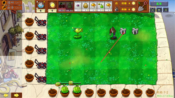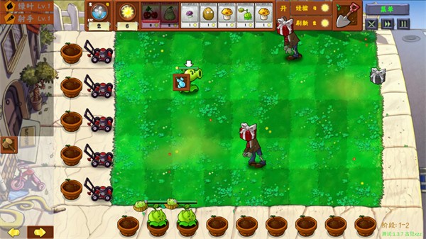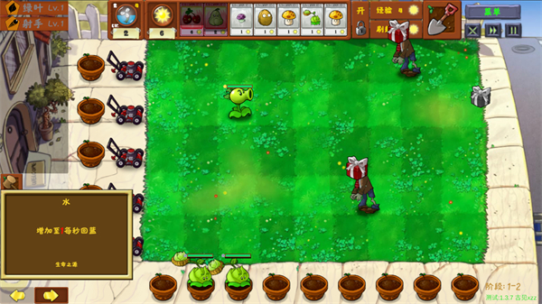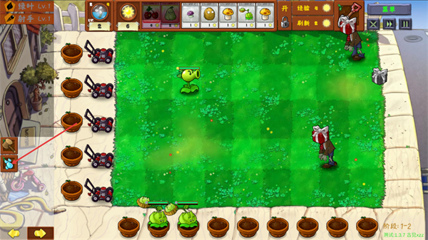 4、在阶段1-2中若僵尸推进速度快,可使用左侧装备给予植物装上,提高豌豆射手的攻击频率,阻挡僵尸靠近草坪左侧区域稳固防线。