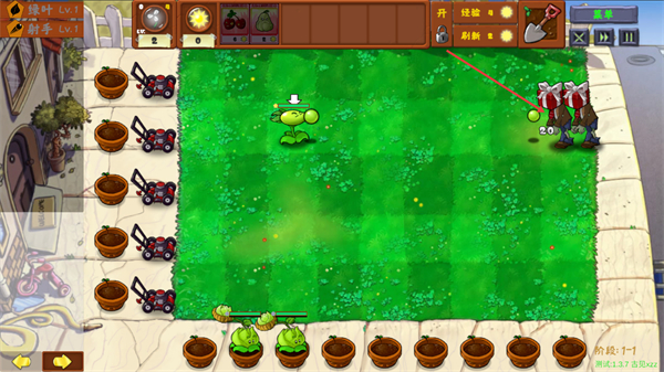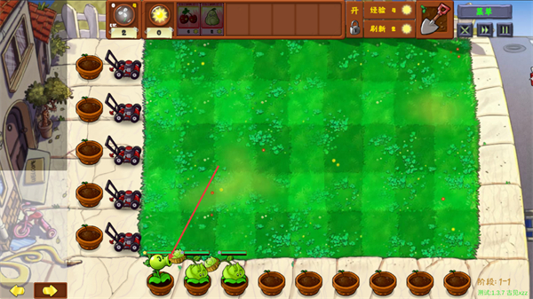 1、进入阶段1-1后,在草坪空位放置豌豆射手类植物,利用其攻击能力应对即将出现的僵尸,同时可借助左侧的花盆等道具布置防线。