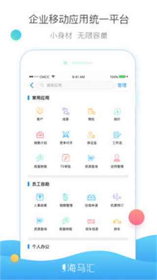 海马汇是汉得自研的企业移动办公平台,聚焦移动运维管理核心需求,搭配移动子应用管理与信息安全保障能力,让办公人员随时随地高效处理事务,简化工作流程,减少沟通成本,显著提升办公效率,全方位满足企业日常办公与移动化管理需求,为企业数字化办公提供稳定便捷的解决方案。