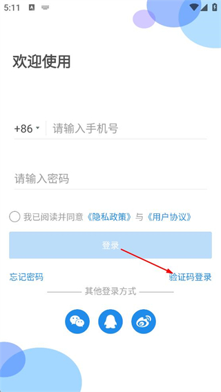2、在登录页面,点击验证码登录选项,切换至手机号快速登录的操作界面。