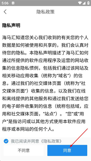 1、在隐私政策页面中,点击同意,即可进入海马汇的登录页面。