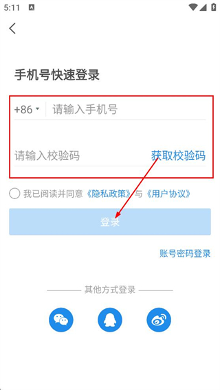 3、填写手机号对应的信息,并填写校验码,点击登录,完成账号登录操作。