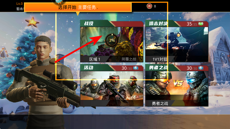 1、进入任务选择界面后,点击红色箭头指向的战役模式区域1阴霾之战,选择该主线任务,开启新的狙击关卡冒险。