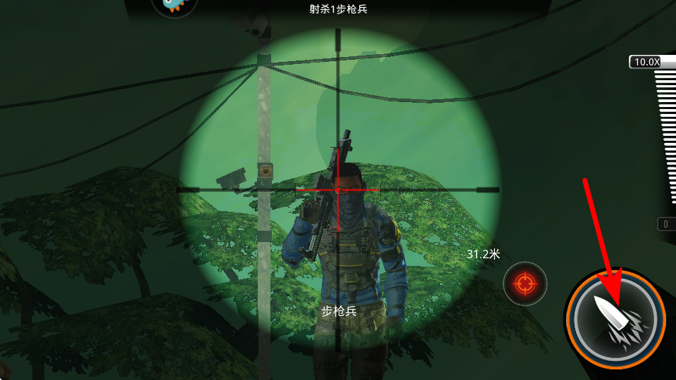 2、进入狙击场景后,瞄准远处的步枪兵,点击红色箭头指向的射击按钮,发起攻击消灭该敌人,推进关卡战斗进度。