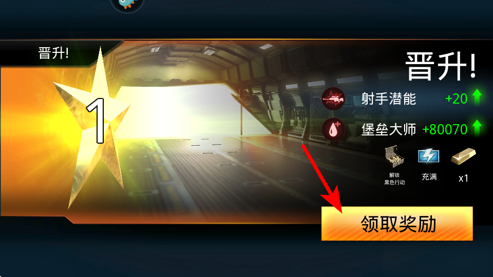 3、完成关卡晋升后,点击红色箭头指向的领取奖励按钮,获取晋升对应的属性加成与道具奖励,提升角色能力。