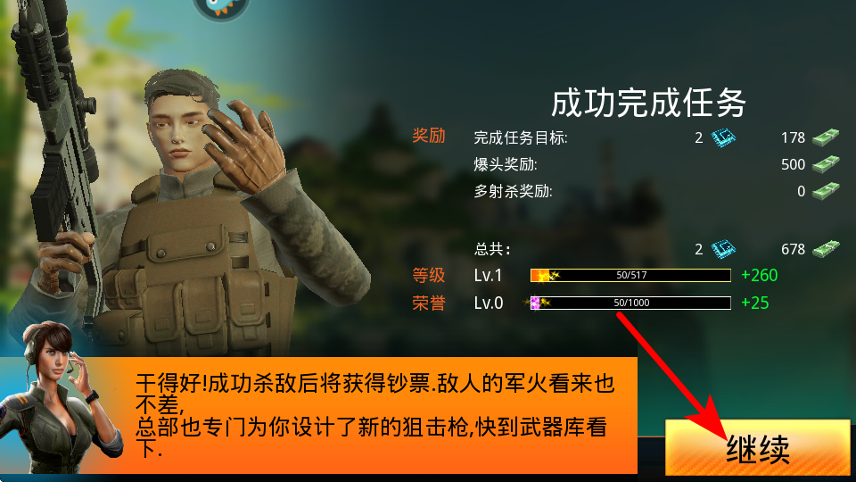 4、任务结算界面中,点击红色箭头指向的继续按钮,进入后续流程,可前往武器库查看新解锁的狙击枪。