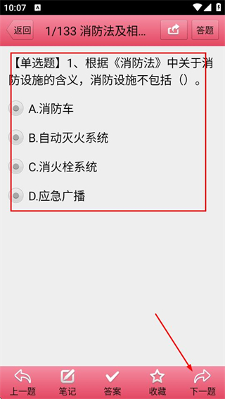 3、在题目页面完成单选题作答后,点击下一题继续进行答题操作。