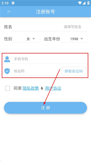 4、在继续填写手机号码和验证码,点击注册,完成账号的注册流程。