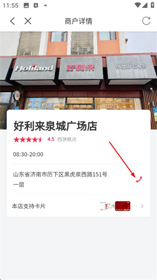 3、在商户详情页面点击电话按钮,可联系该商家进行咨询。