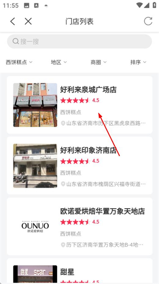 2、在门店列表页面选择目标店铺,进入该商户详情页面。