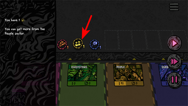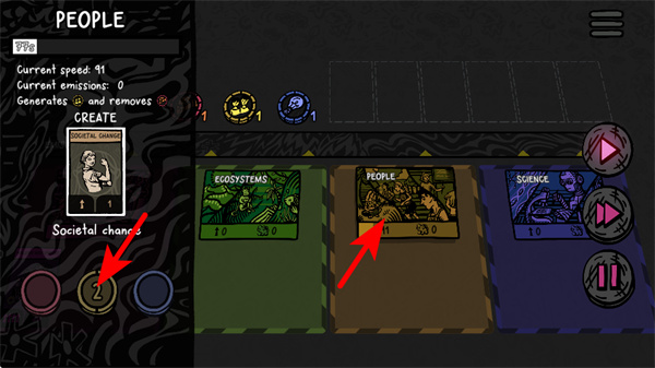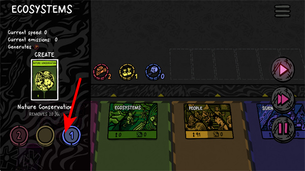 4、切换到生态板块后,点击红色箭头指向的蓝色货币,消耗该资源解锁自然保护卡牌,提升生态板块的资源效率。