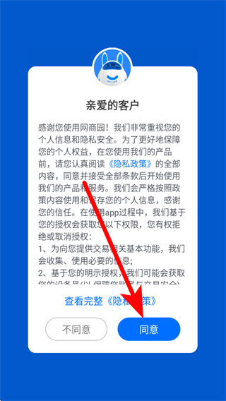 1、打开网商园,在弹窗中点击同意,进入应用首页。