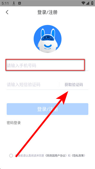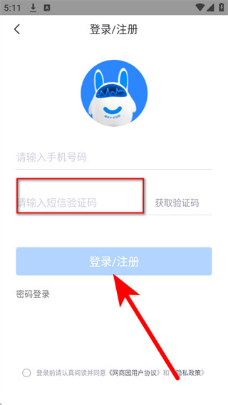 4、将收到的短信验证码填入验证码栏,勾选相关协议后点击登录注册,即可完成账号登录。