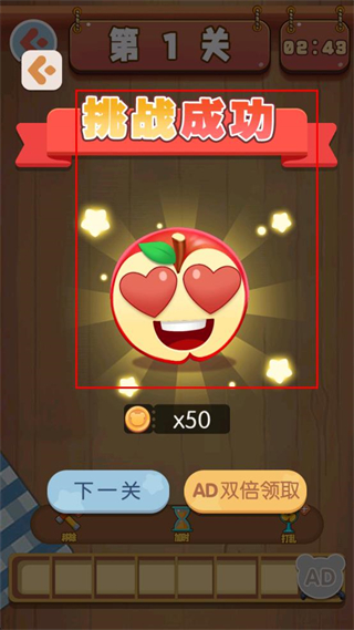 4、等待界面显示挑战成功提示,获取对应的50金币奖励,随后点击下一关按钮进入下一轮游戏。
