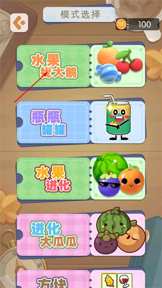 1、点击游戏主界面中的开始游戏按钮,进入模式选择页面后,点击水果找大鹅选项。