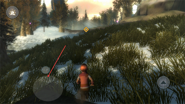 3、在游戏场景中,操控左下角的移动按钮控制角色移动,前往场景内的目标标识位置推进冒险。