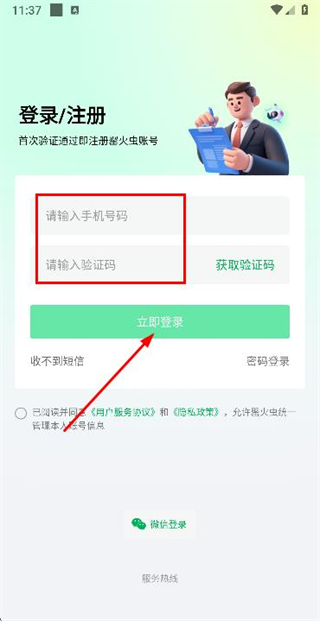 3、在登录页面填写手机号和验证码,勾选协议后点击立即登录按钮完成登录。