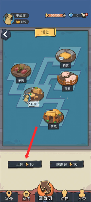 3、在室内活动界面,点击红色箭头指向的上床按钮,消耗对应资源让狗狗进行休息互动,积累养成进度。