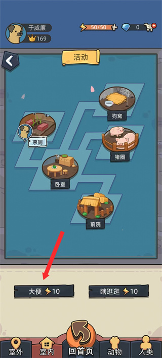 4、后续点击红色箭头指向的大便按钮,完成狗狗的日常互动操作,持续推进角色的养成流程。